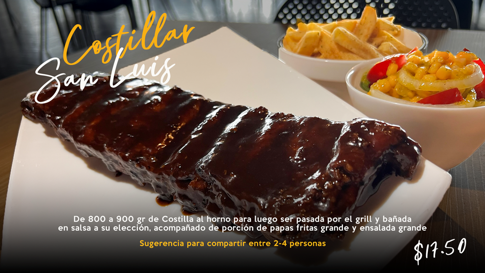 800-900gr de Costilla corte san luis, al horno en salsa a tu elección. Sugerido para 2 personas $17.50